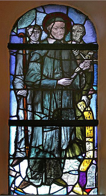 Vincent de Paul, standing, cassock, mantle, skullcap, halo, holding crucifix; two men standing behind; original in Mariaveld church, Susteren, Limburg, former CM parish; internet image