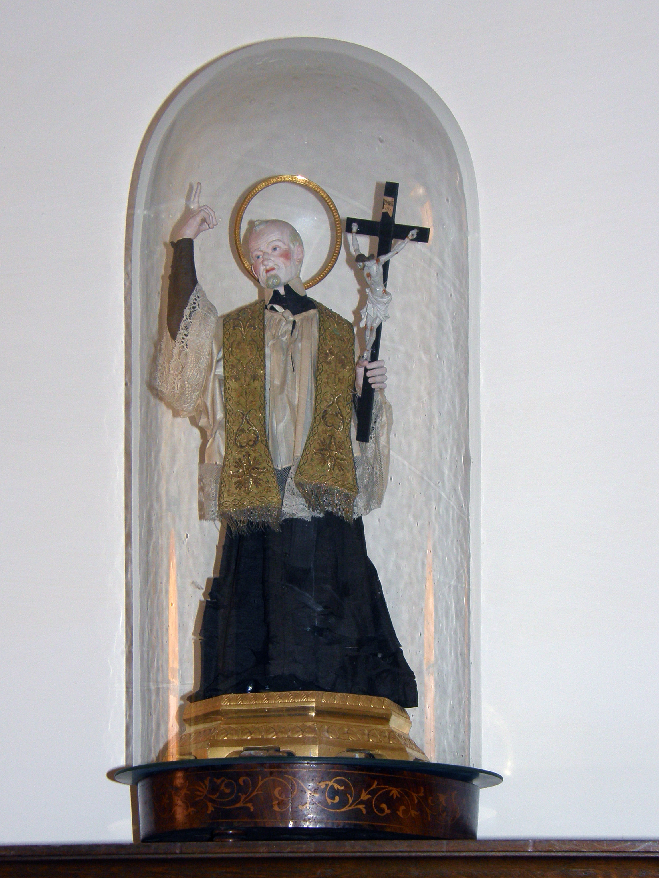 Clothed statue under glass cover; in San Sylvestro al Quirinale