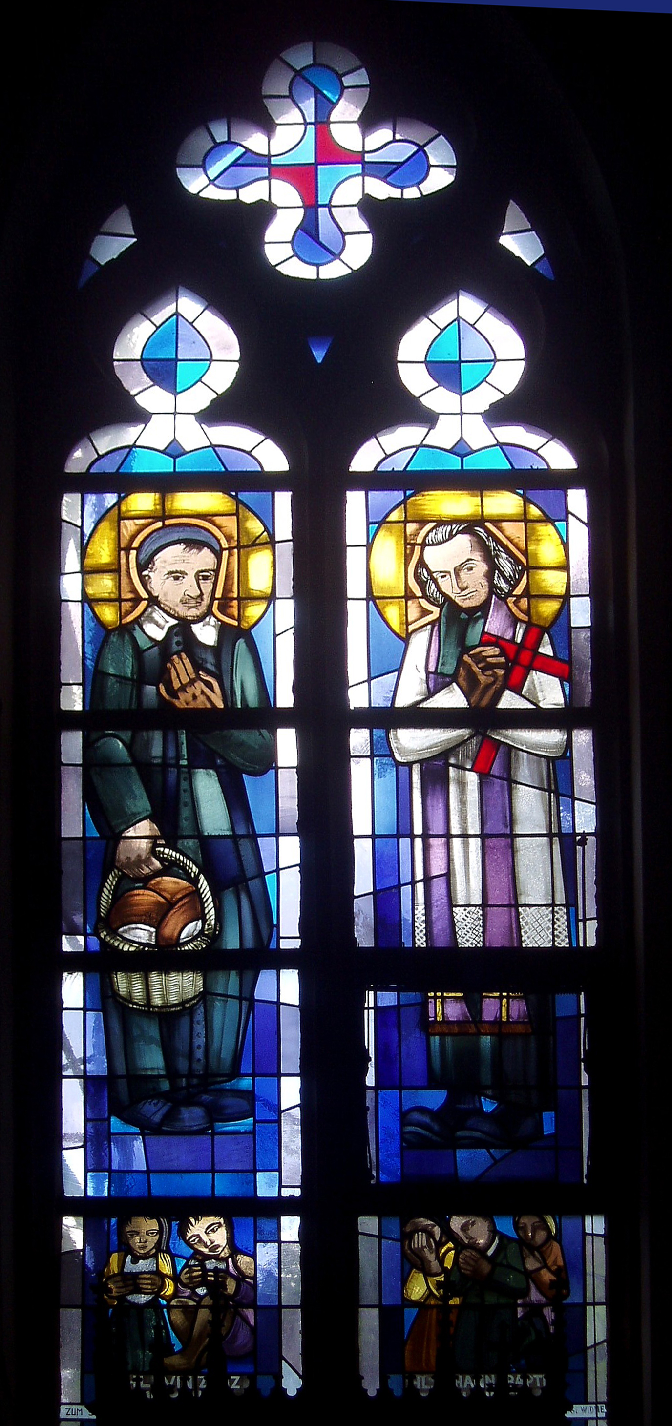 Vincent de Paul standing holding basket with bread for poor; original in cathedral of Eupen; internet image, may be copyrighted