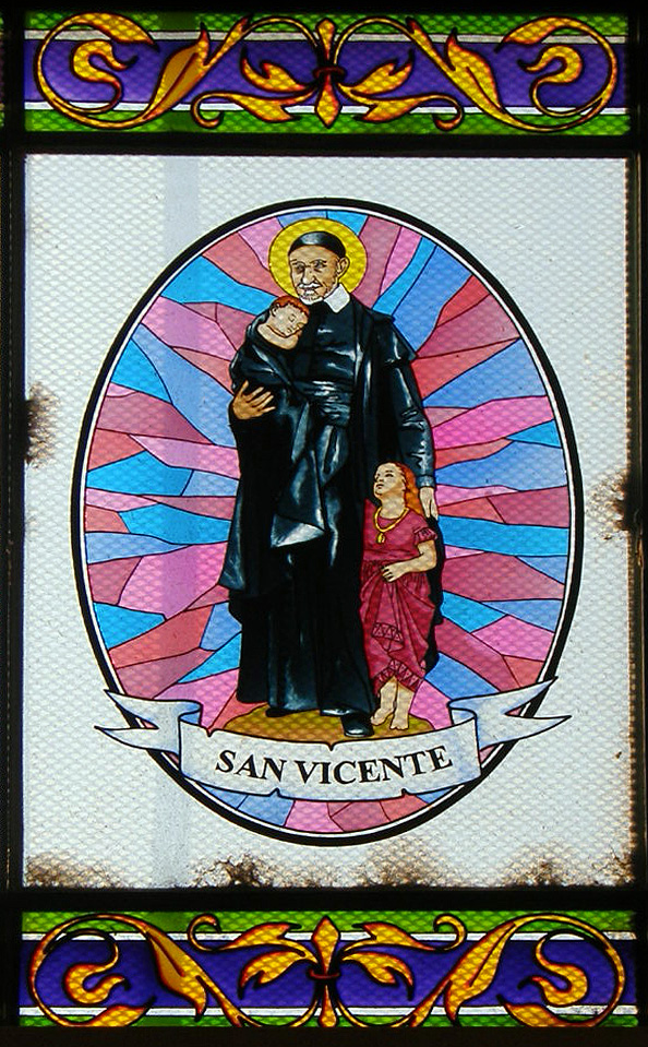 Painted glass; Vincent de Paul with two children; in Vincentian parish church, Ica