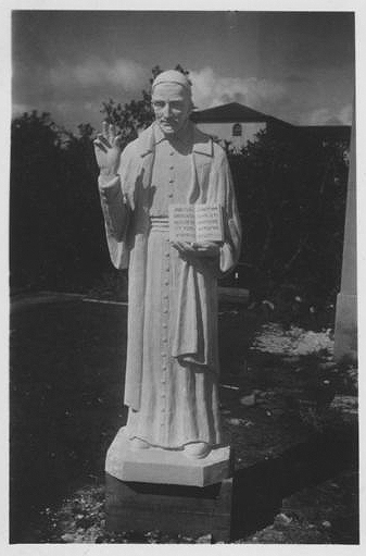 Photograph of statues, now destroyed, in Lisbon, Casa Grande, work of lay brother, José Vieira; Text: Haec Congregatio necesse est ut totis viribus spiritum Christi induere nitatur. (C. Rules I, 3)