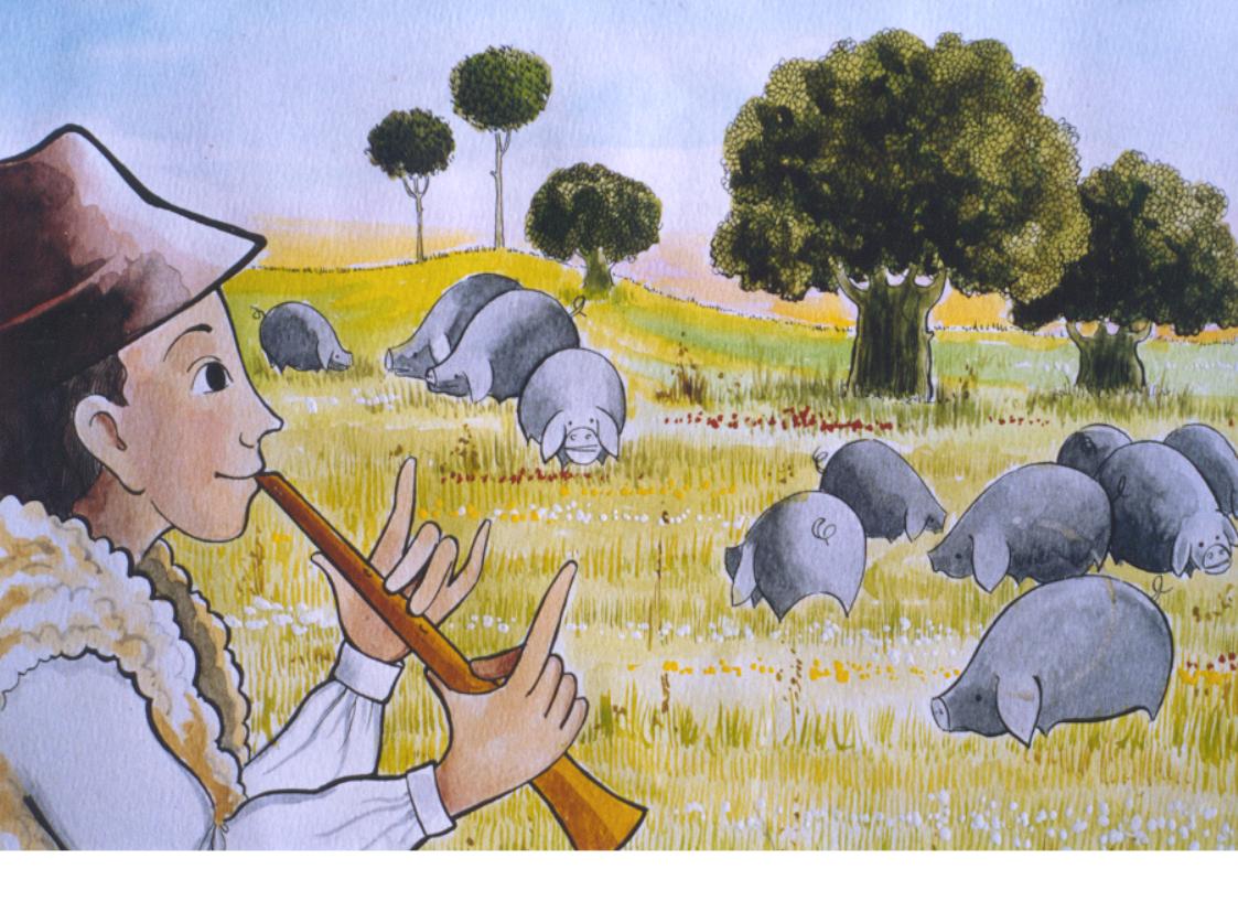 Vincent de Paul as child, with sheepskin vest, playing recorder in field with pigs, oak trees