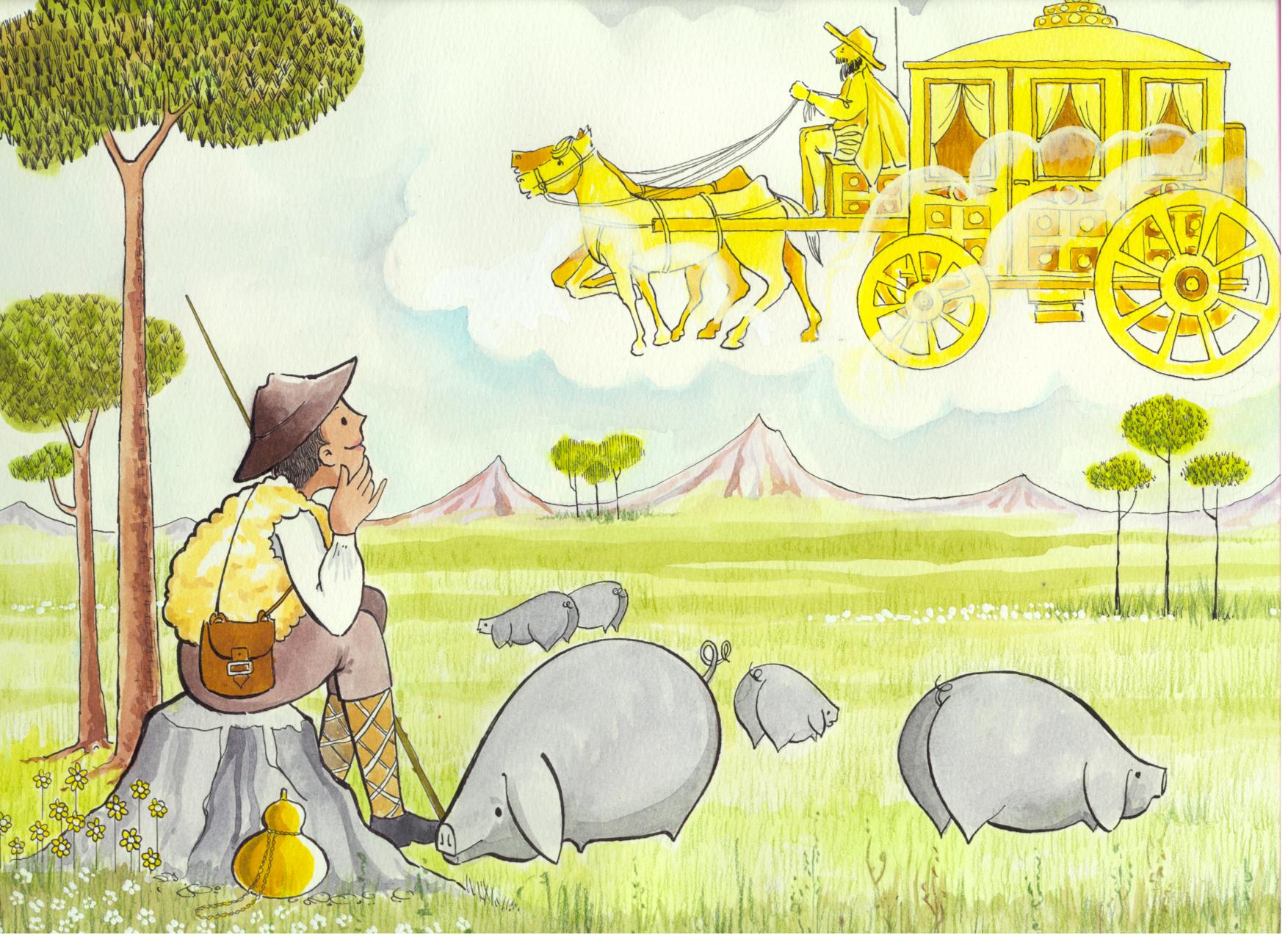Vincent de Paul, herding animals, dreams of noble life with elegant carriage; Pyrenees in background