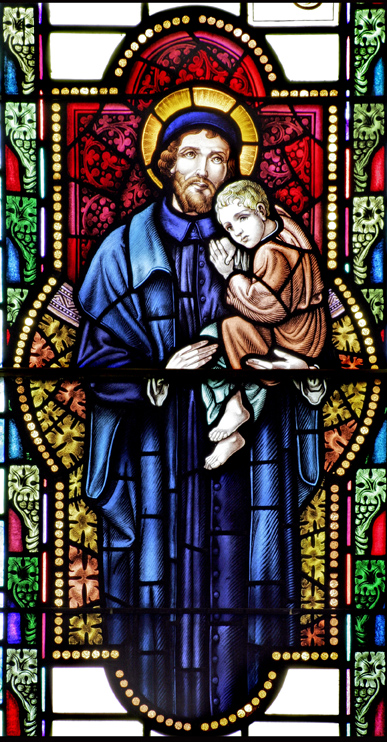 Vincent de Paul, young, sandy hair; cassock, mantle, skullcap, halo; holding child; courtesy of Fr. Gene Plaisted, OSC