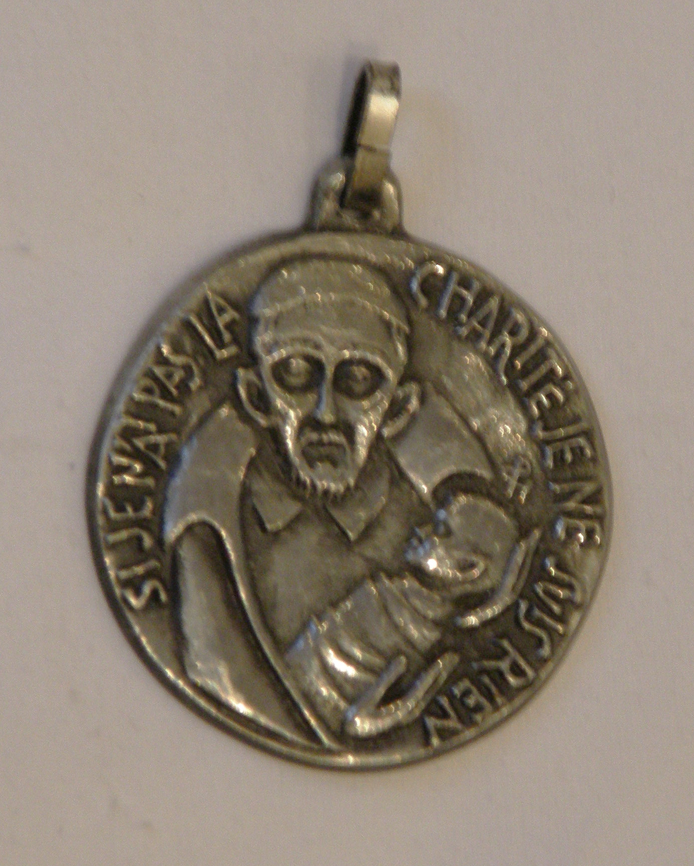 Round silver medal, with loop and ring, Vincent de Paul, cassock, cape, skullcap, holding infant; French text: "If I do not have charity, I am nothing." Original in Vincentian mother house, Paris