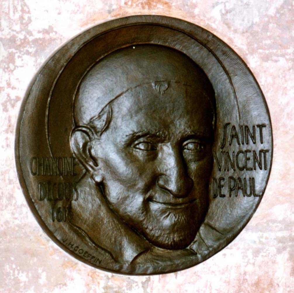 Obverse, bronze plaque, Vincent de Paul, cassock, surplice, skullcap, halo, inscribed Canon of Ecouis 1615; artist, J. H. Coeffin; original in parish church of Ecouis