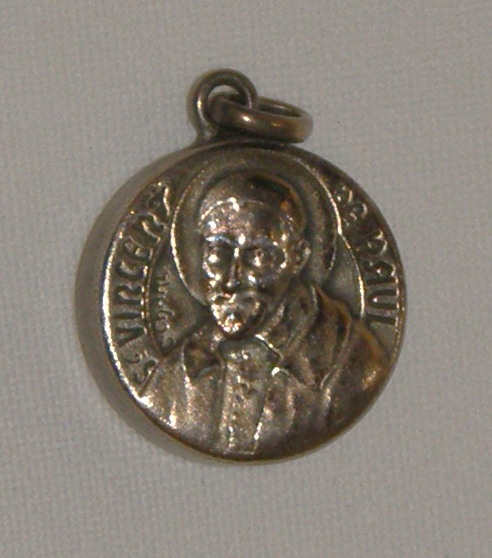 Obverse, round silver medal, with loop, ring; Vincent de Paul bust, cassock, mantle, skullcap, halo; sculptor: C. Charl (?); original in Daughters of Charity provincial house, Turin