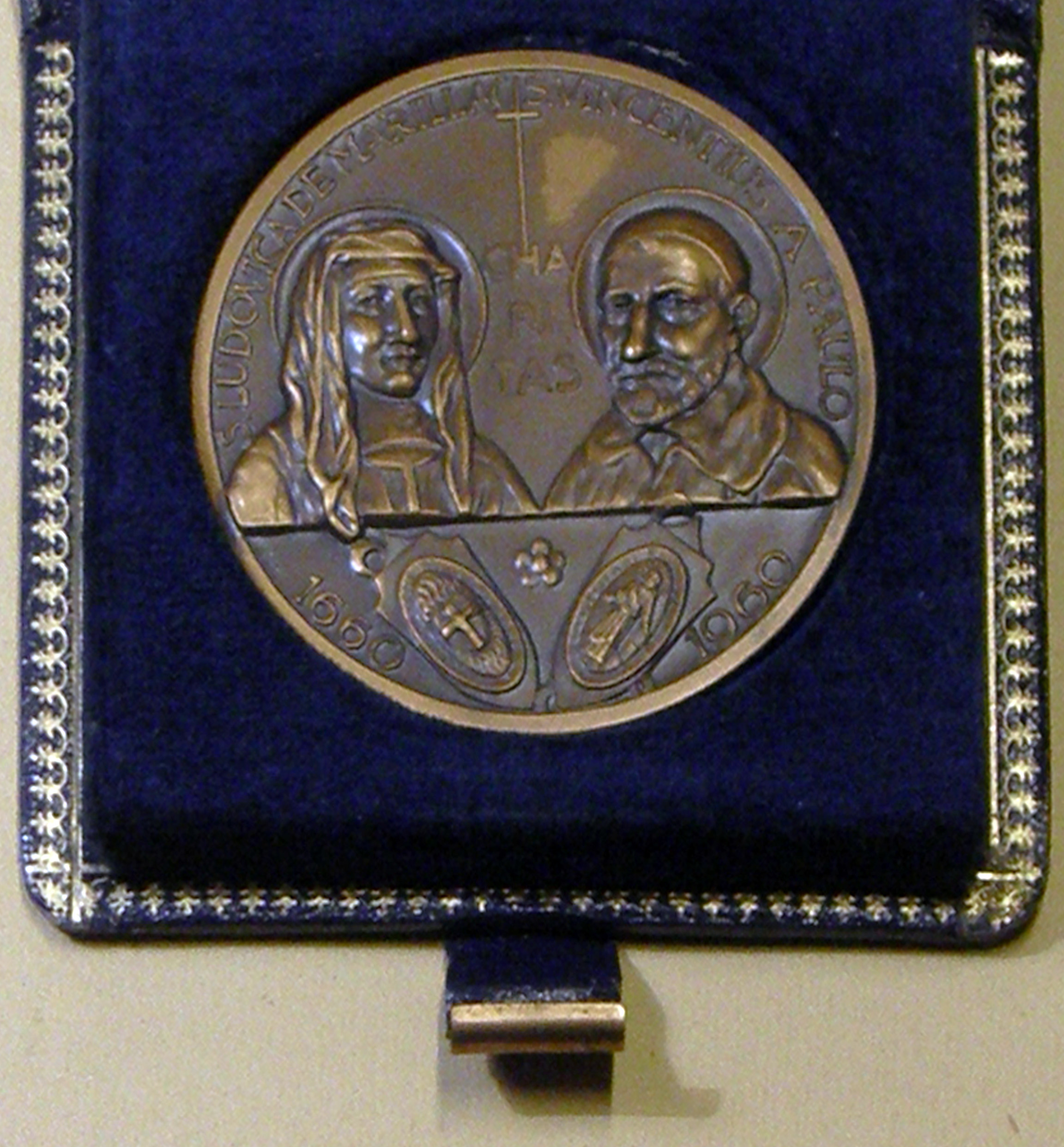 Vincent de Paul and Louise de Marillac medallion, for 1960 anniversary; emblems of two communities below; in presentation wallet
