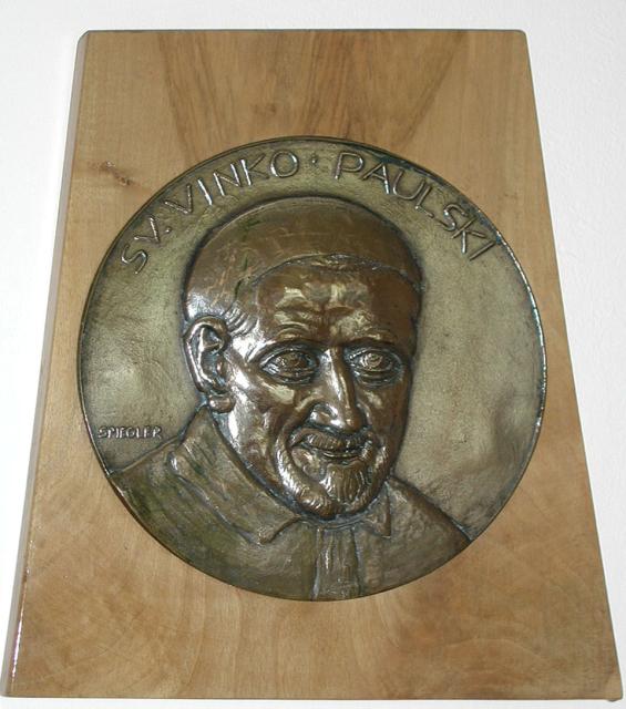Round bronze plaque mounted on wooden back; Croatian form of Vincent de Paul. Original in Vincentian house, Zagreb (Vincentian province of Slovenia).