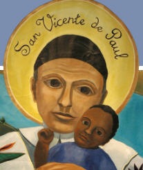 Painting (illustration?); Vincent de Paul, skullcap; large halo with his name in Spanish; holding black child (based on Lentz motif?); location of original unknown; internet image