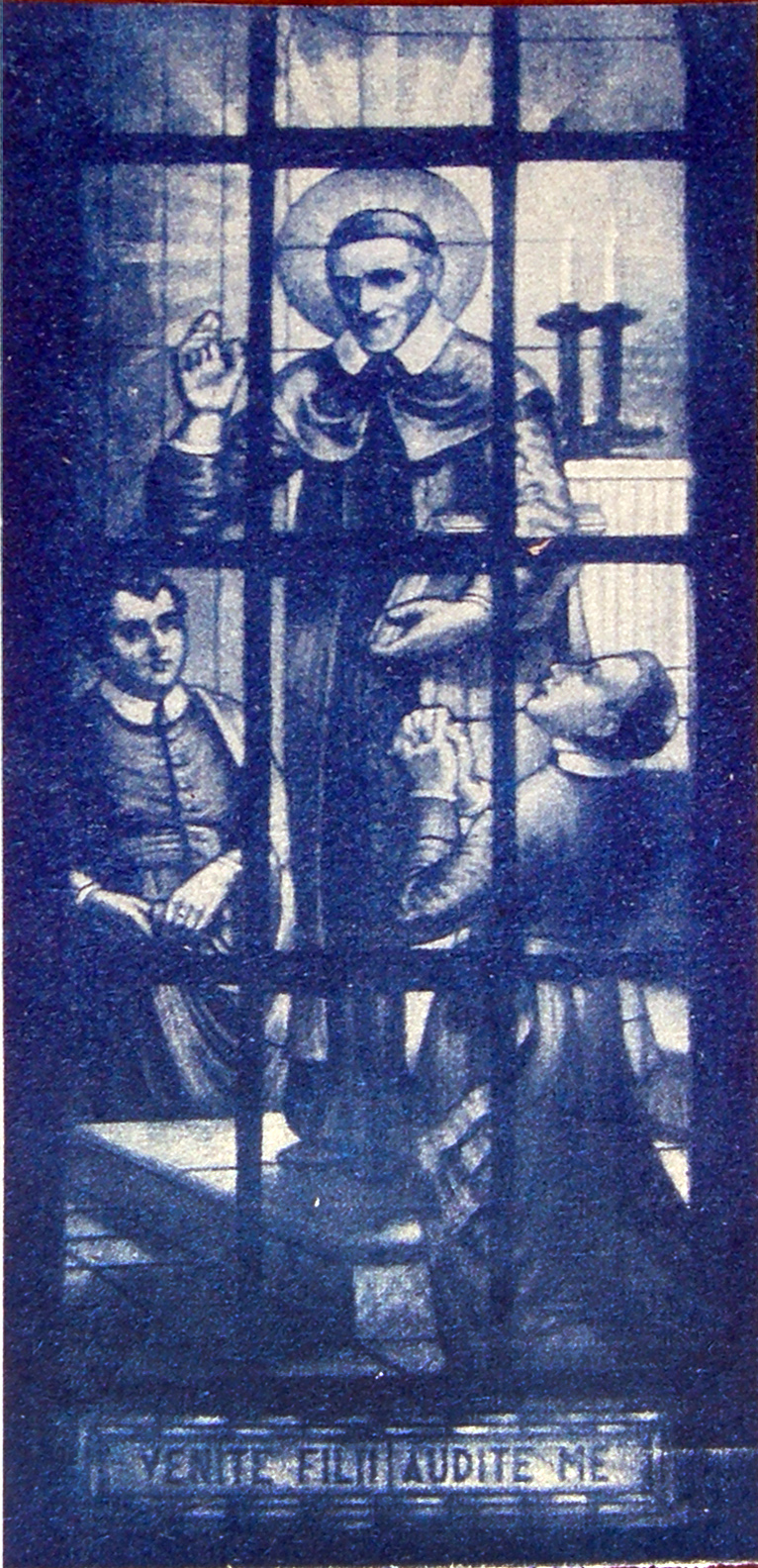 Latin text: Come, children, hear me Photograph of a photograph reproduced in blue