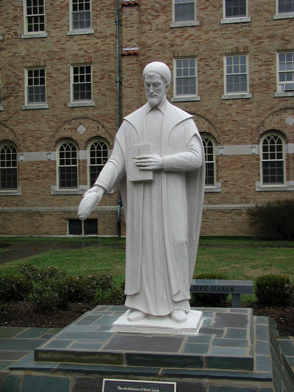 Carved stone statue, Vincent de Paul, holding book, distributes loaf of bread. Original in courtyard, Kenrick-Glennon Seminary, St. Louis
