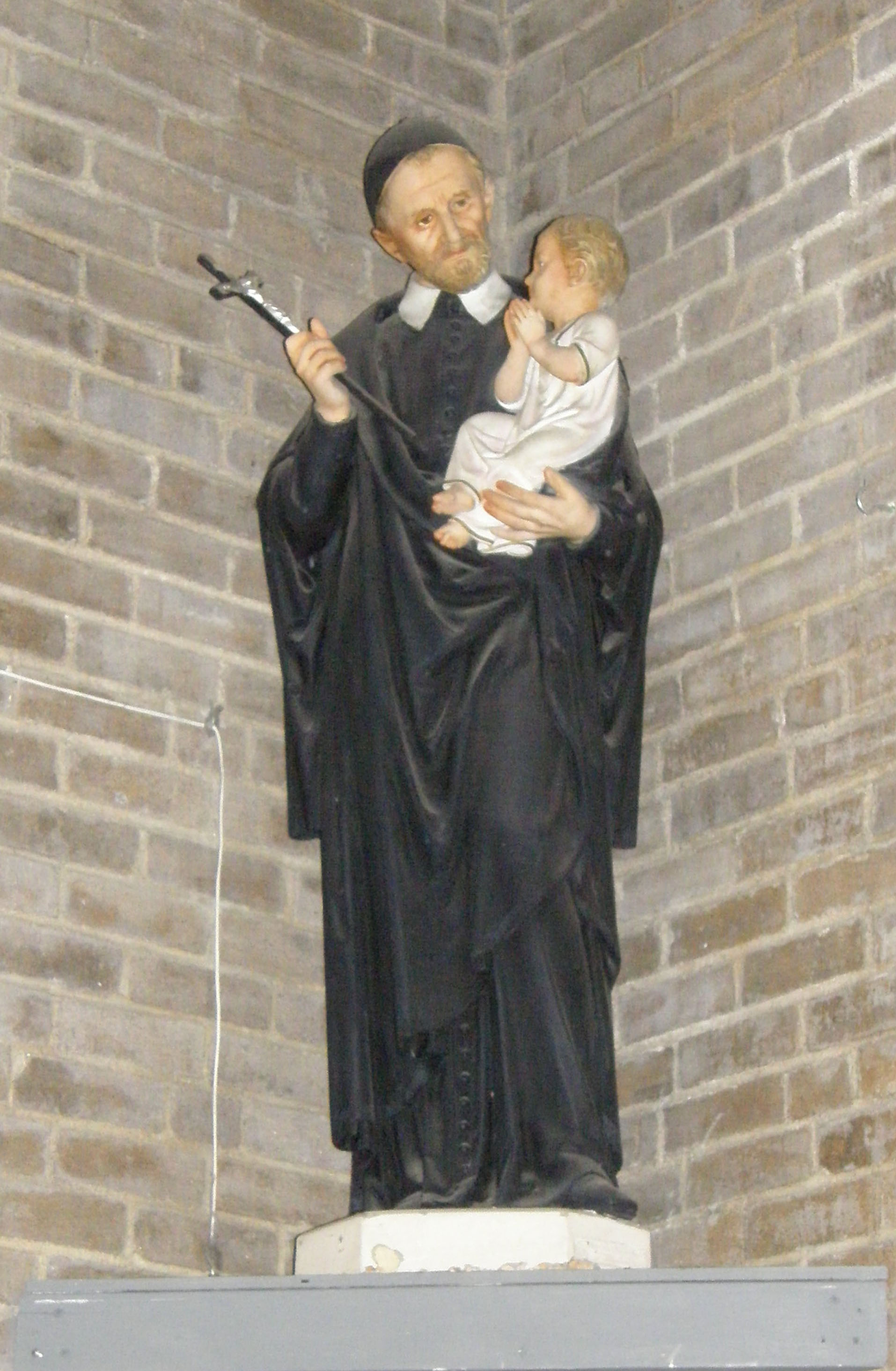 Painted plaster; Vincent de Paul, standing, cassock, mantle, skullcap, light hair; shows crucifix to child on his arm; original in St. Vincent's parish hall, St. Louis