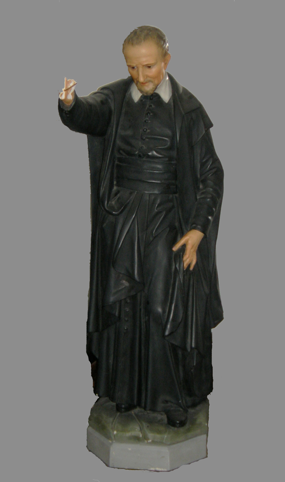 Painted plaster; Vincent de Paul, standing, cassock, mantle (unusual details: edge tucked into wide cincture, lifting mantle with left hand); right hand broken, probably held crucifix; original in St. Vincent's church, St. Louis