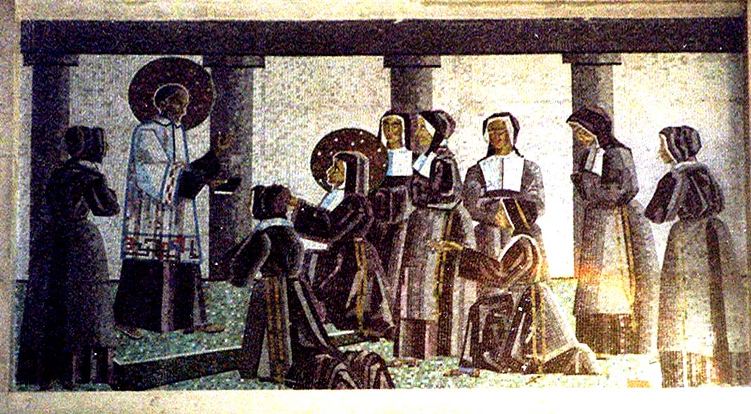 Mosaic; Vincent de Paul, standing, cassock, surplice, stole, skullcap, halo; giving rule book to St. Louise de Marillac, Daughters of Charity; for Society of St. Vincent de Paul, Madrid