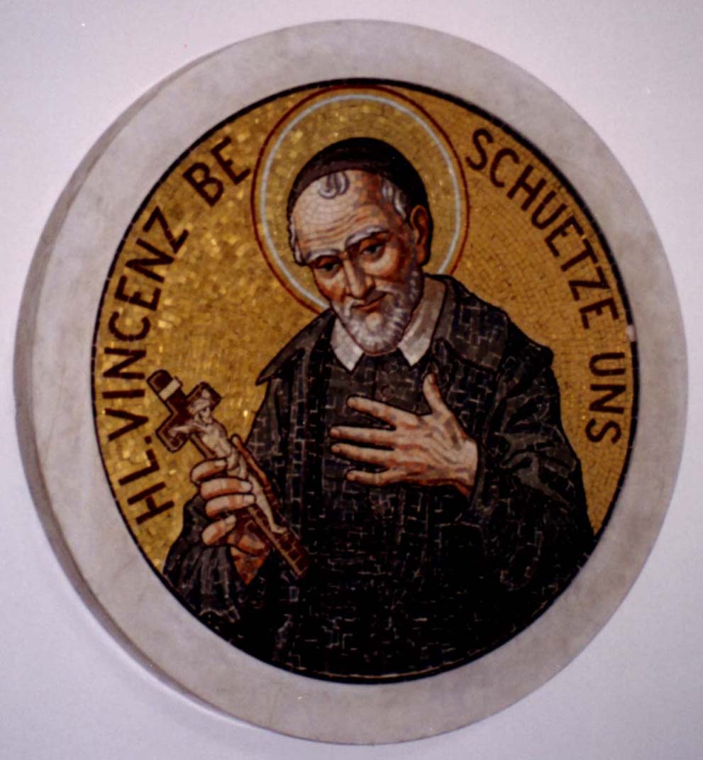 Vincent de Paul, cassock, mantle, skullcap, halo, holding crucifix; German: St. Vincent protect us. Original in Innsbruck