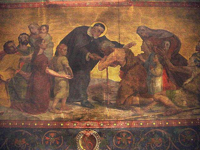 Altar mosaic, church of St. Pierre, Macon; Vincent de Paul assists the poor of Macon; SV monogram in the lower frame.