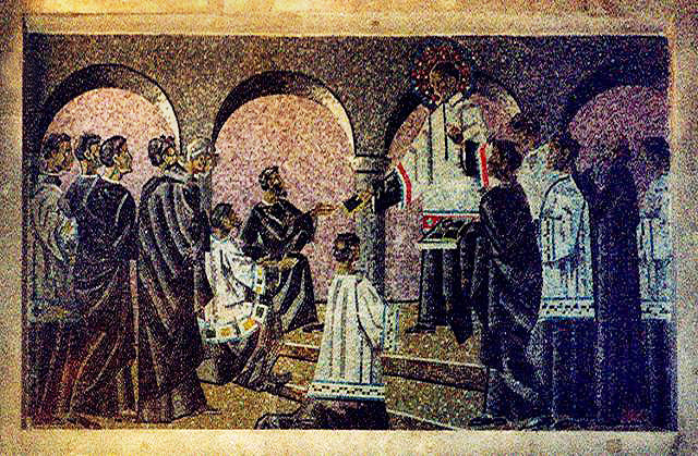 Mosaic; Vincent de Paul, standing, cassock, surplice, stole, skullcap, halo; distributes rules to his priests; original in Vincentian church, Seville