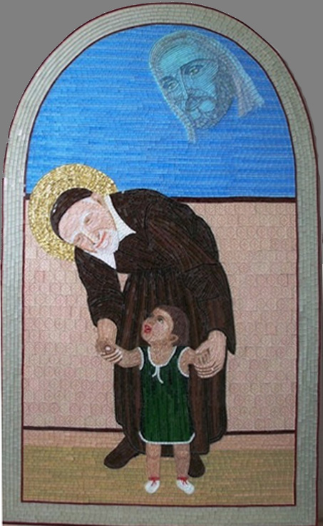 Glass mosaic; Vincent de Paul, cassock, cincture, skullcap, gold halo; head of Jesus looking down; internet image; may be copyrighted