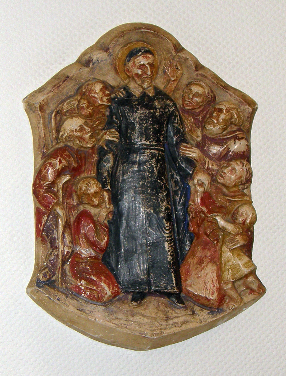 Wooden plaque, stained; Vincent de Paul, standing, cassock, cincture, skullcap, halo; with figures of poor persons; in Vincentian house, Panningen