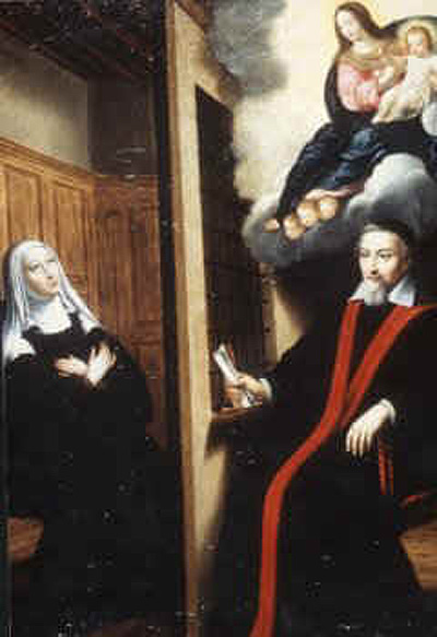 Painting; Vincent de Paul, seated, cassock, red stole, skullcap; in front of grille; Sister, white veil of novice behind; Virgin Mary and Child Jesus above, with angel heads, clouds; location of original unknown