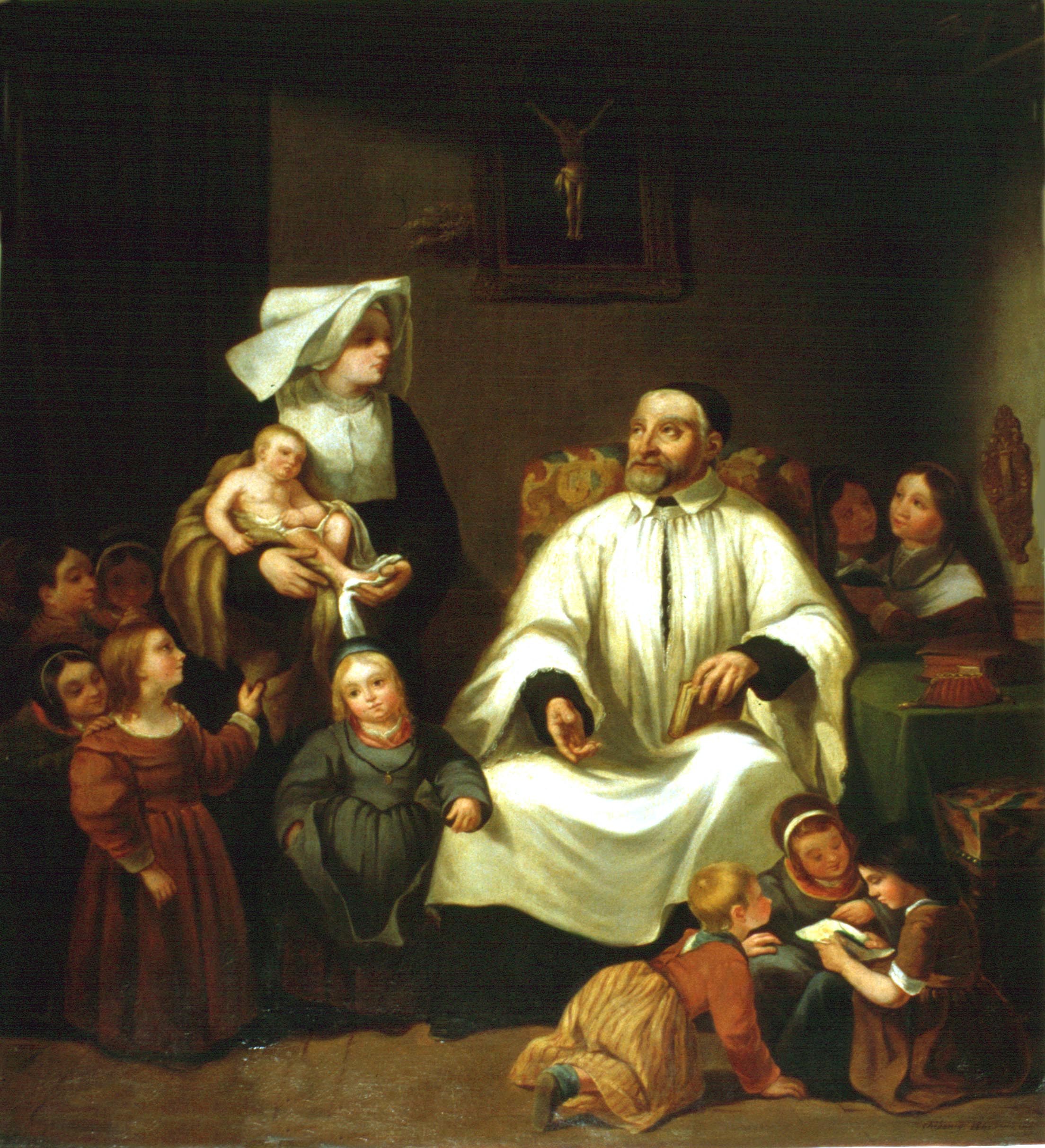 Oil on canvas, Vincent de Paul, seated, cassock, surplice, skullcap, gesturing to Daughter of Charity; surrounded by children; artist, Chibourg, dated 1841, after Landes (?)