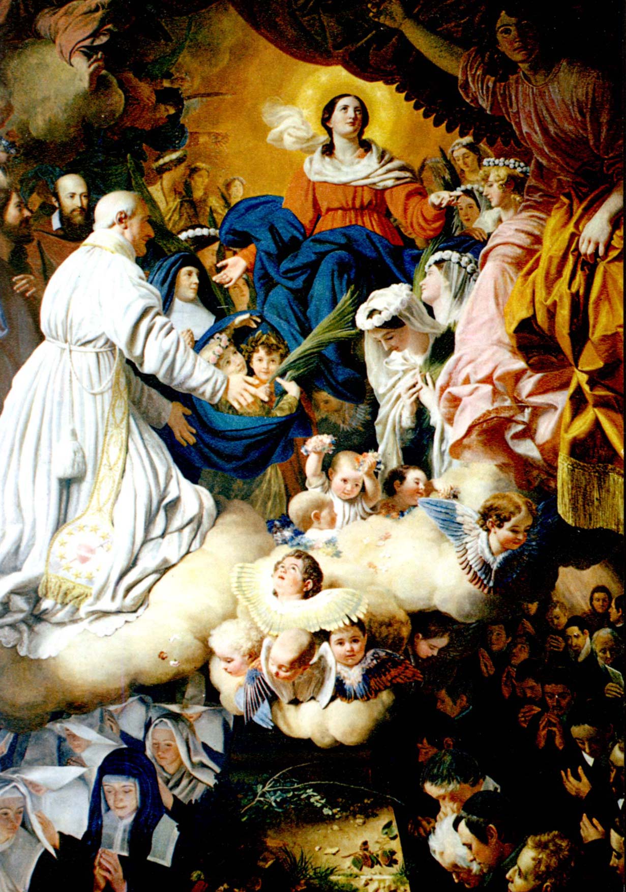 Oil on canvas; Vincent de Paul, kneeling, alb, cincture, stole, with other saints, presents Priests of the Mission and Daughters of Charity to Mary; work of Bro. François Carbonnier; original in Vincentian mother house