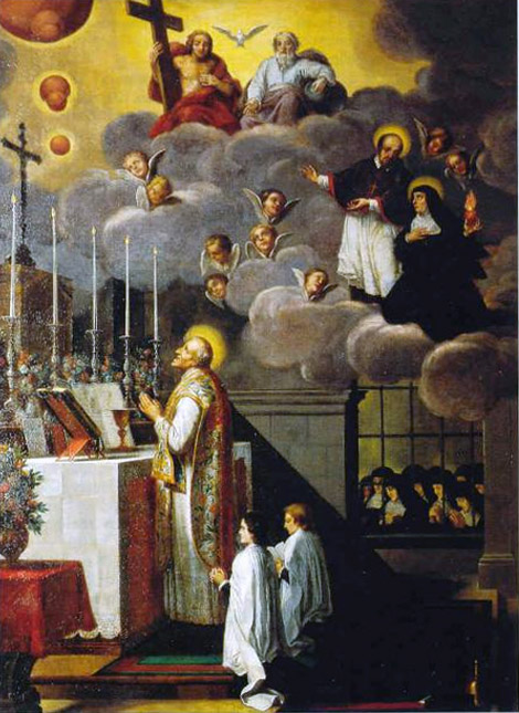Oil on canvas; Vincent de Paul in mass vestments; vision of globes; Francis de Sales, Jeanne de Chantal in heaven before Trinity; Sisters of Visitation behind grille below; original by Gaetan Sontin, in Vincentian mother house