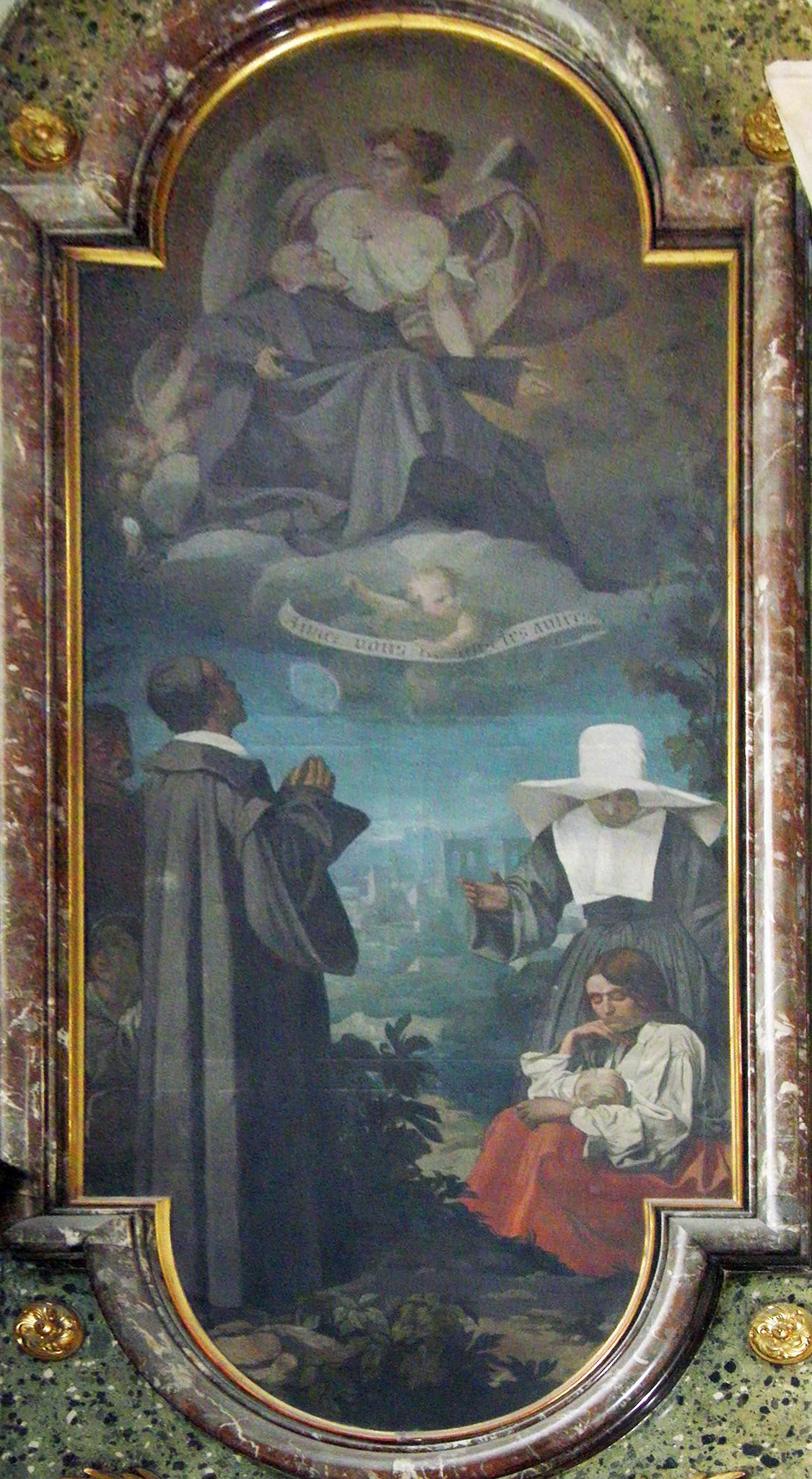 Vincent de Paul, cassock, mantle, resting on a cloud; priest below, praying; Sister caring for woman and child. Ribbon text: Love one another. Artist: Charles Porion, 1846