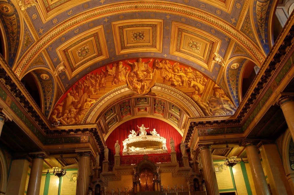 Oil on shaped canvas, Vincent de Paul, seated, cassock, surplice; with Vincentians on his right and Daughters of Charity on his left; work of Bro. François Carbonnier; chapel of Maison mere