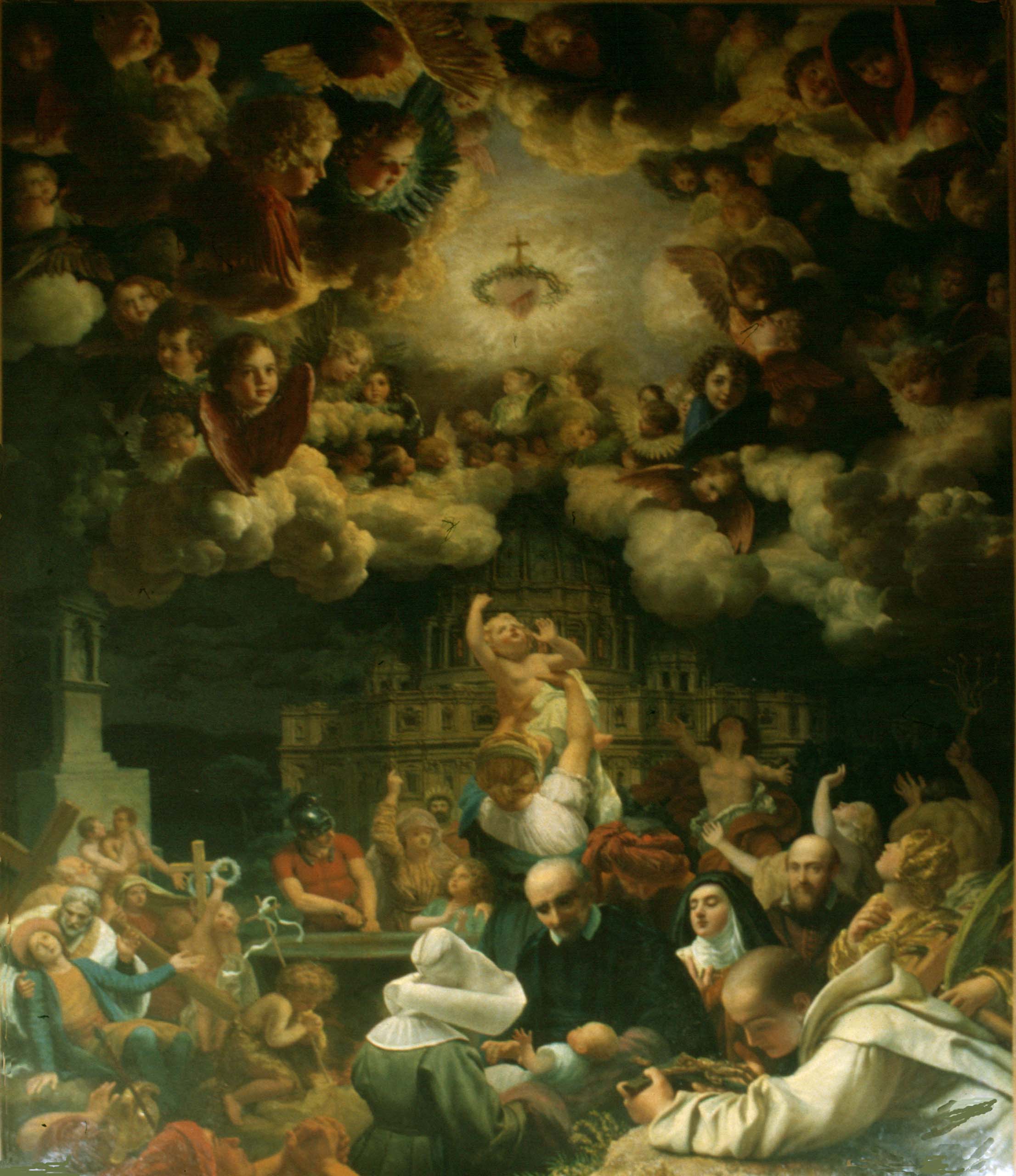 Vincent de Paul, cassock, mantle; saints, sufferers; Daughter of Charity; St. Peter's in background; Sacred Heart above; work of Bro. François Carbonnier