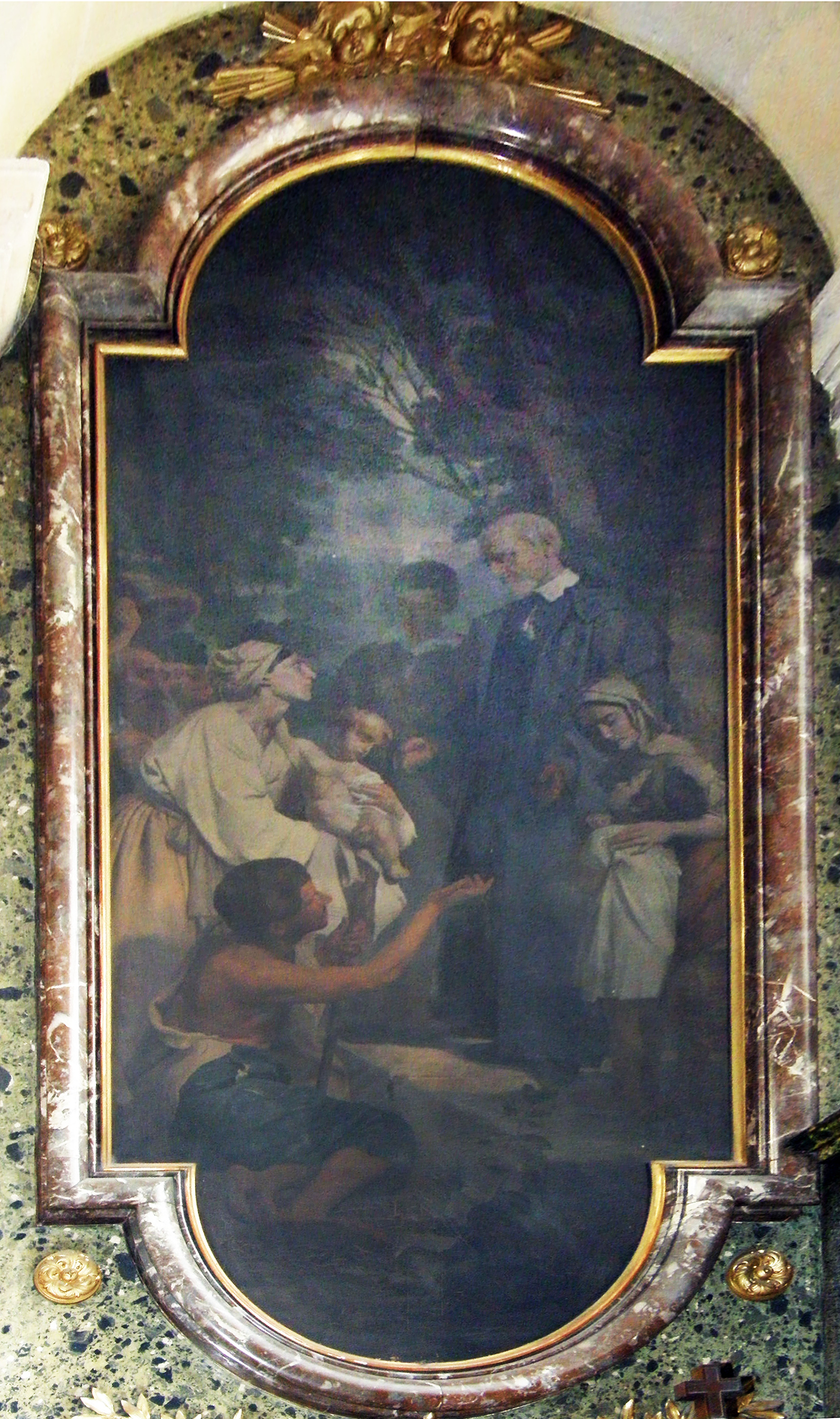 Vincent de Paul, standing, cassock, mantle, helping the country poor; in church of St. Roch; artist: Charles Porion