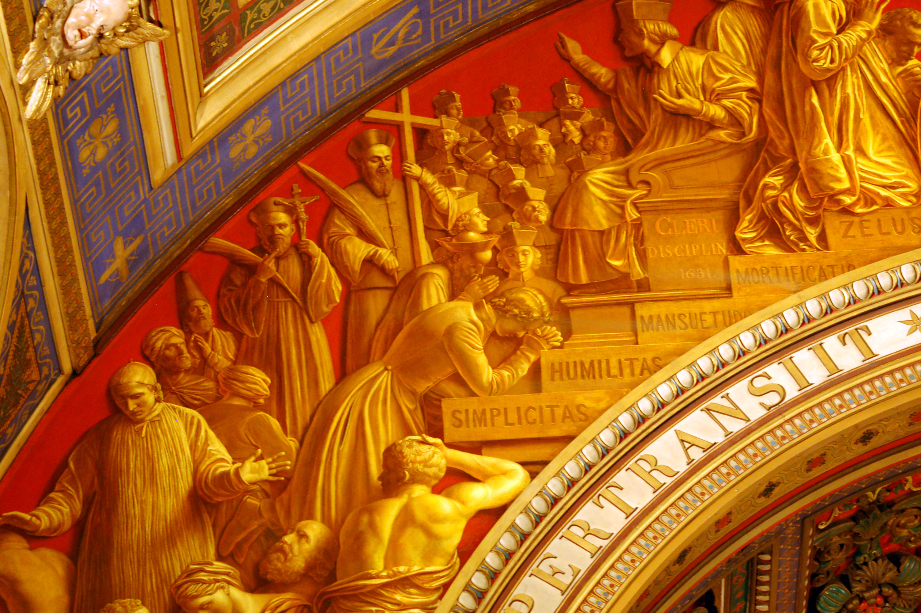 Five characteristic virtues: simpliciy, humility, meekness, mortification, zeal, on stairs