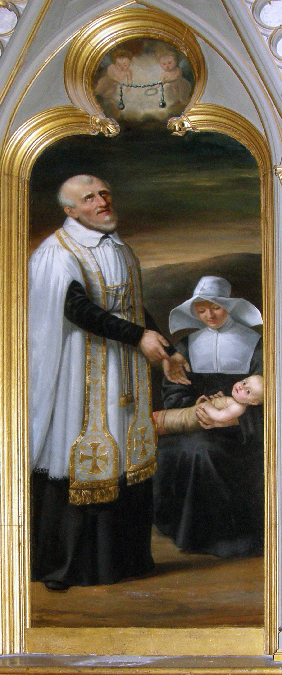 Vincent de Paul, standing, cassock, surplice, white stole; with a Daughter of Charity holding child; galley prisoner chains above; parish church, location not noted