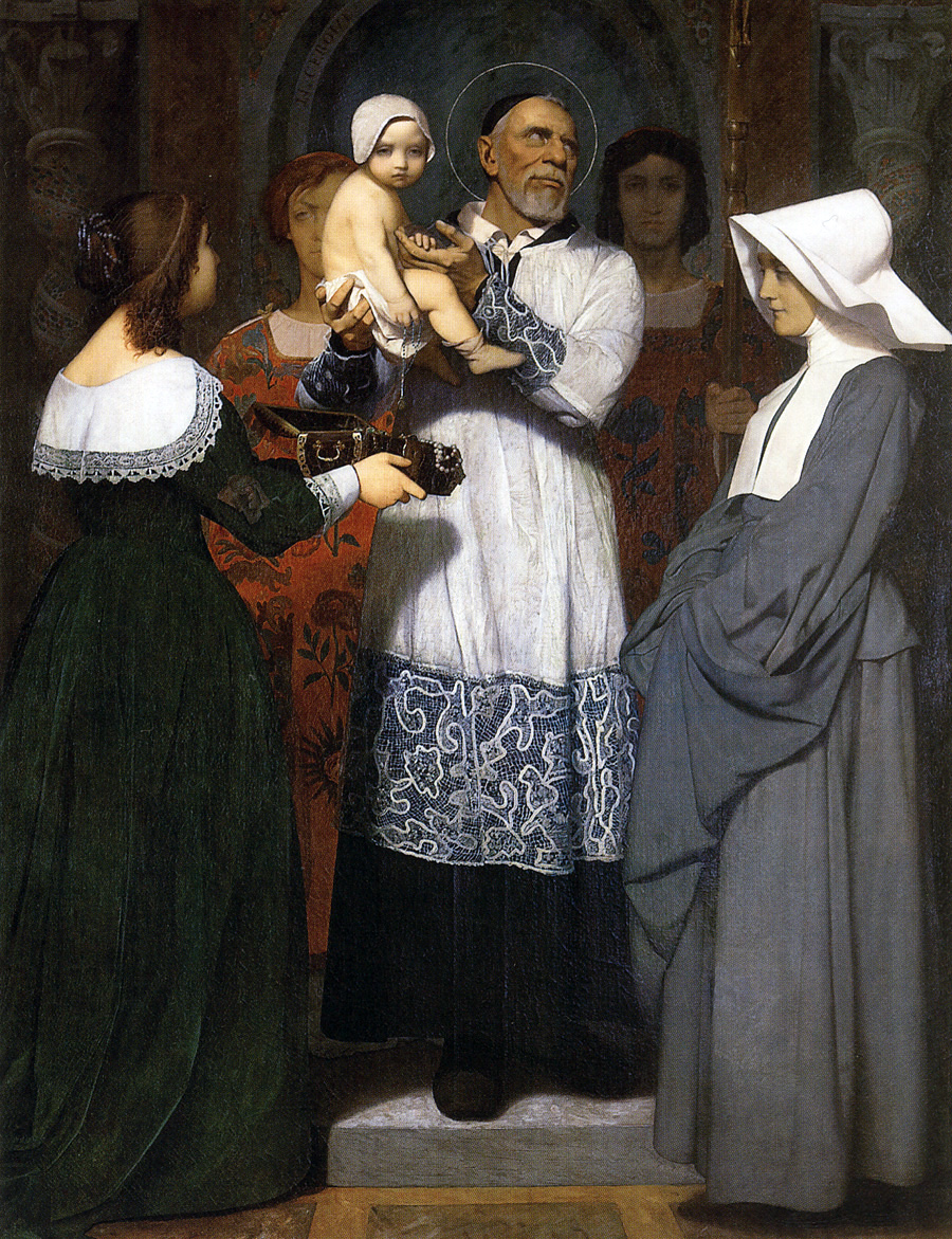 Vincent de Paul holding child, with Ladies of Charity, Sister
