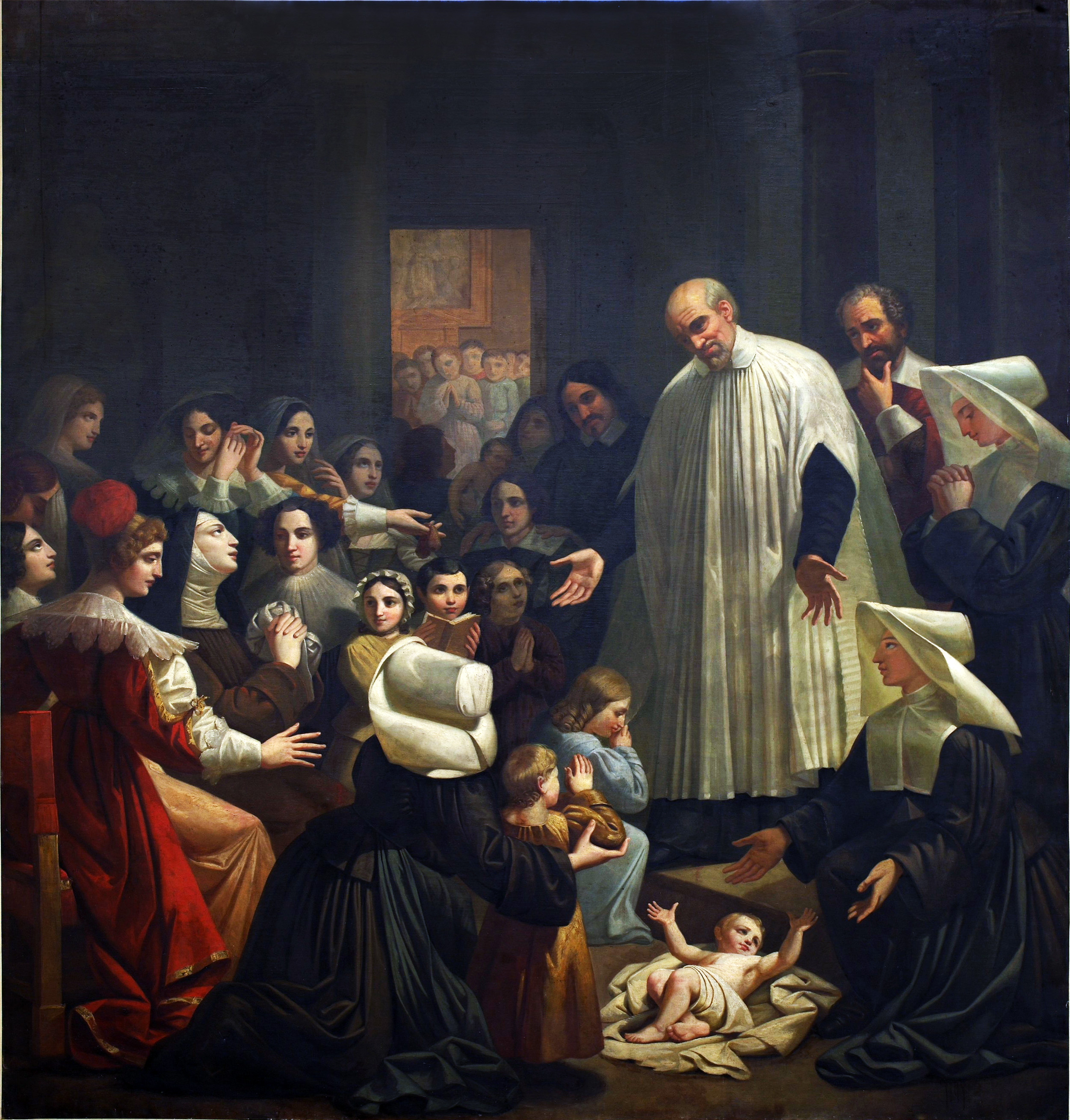 Louise de Marillac in Carmelite-style habit; women donating jewelry (ear rings) for the care of foundlings by the Daughters of Charity; painting in storage; previously at chapel of St. Lazare prison; unsigned painting