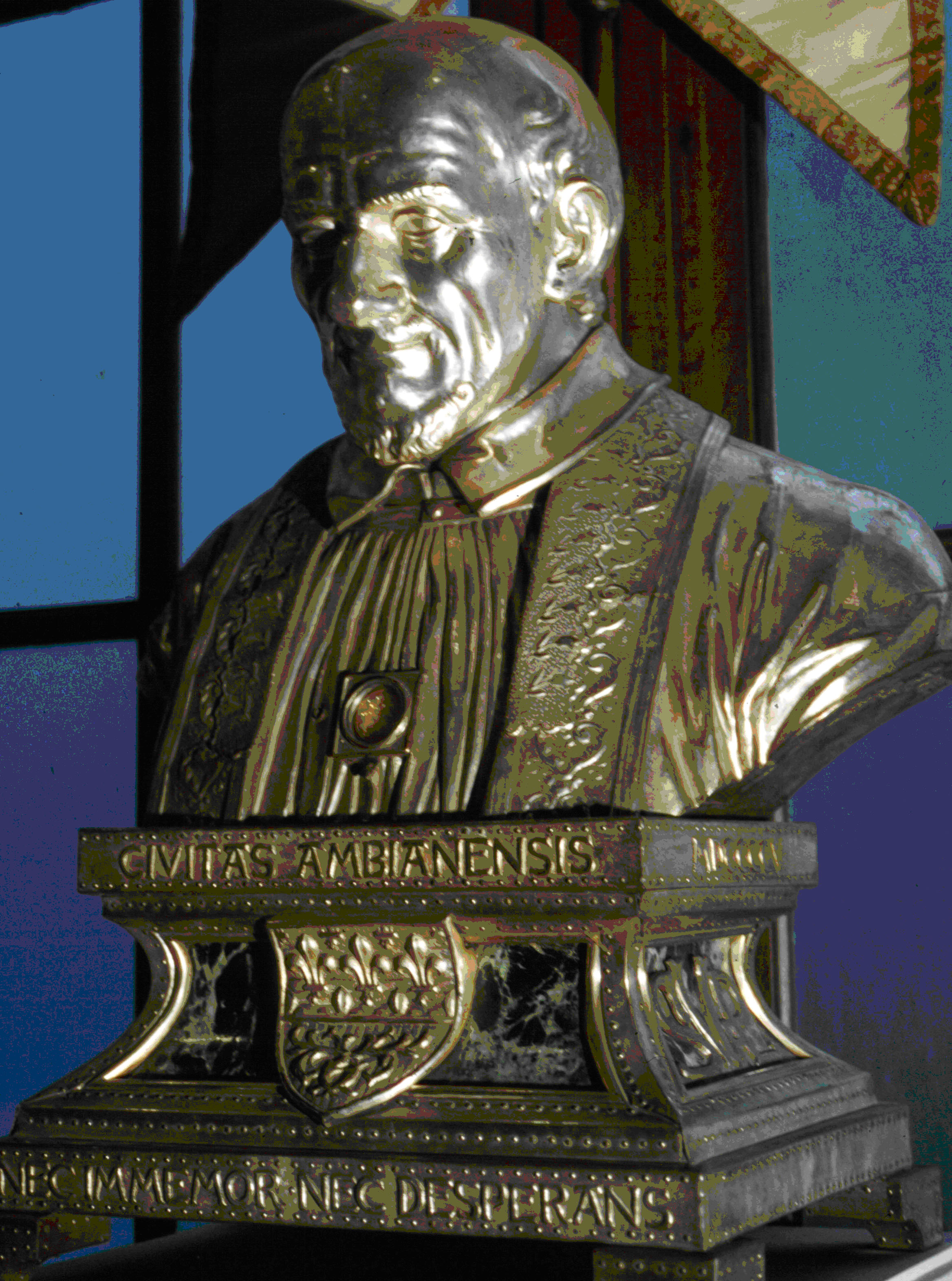 Plated copper bust, Vincent de Paul, with reliquary and relic. Made in 1836 for seminary of Amiens; base, with inset marble, added in 1905. Original in Musée vincentien, Vincentian mother house, Paris.