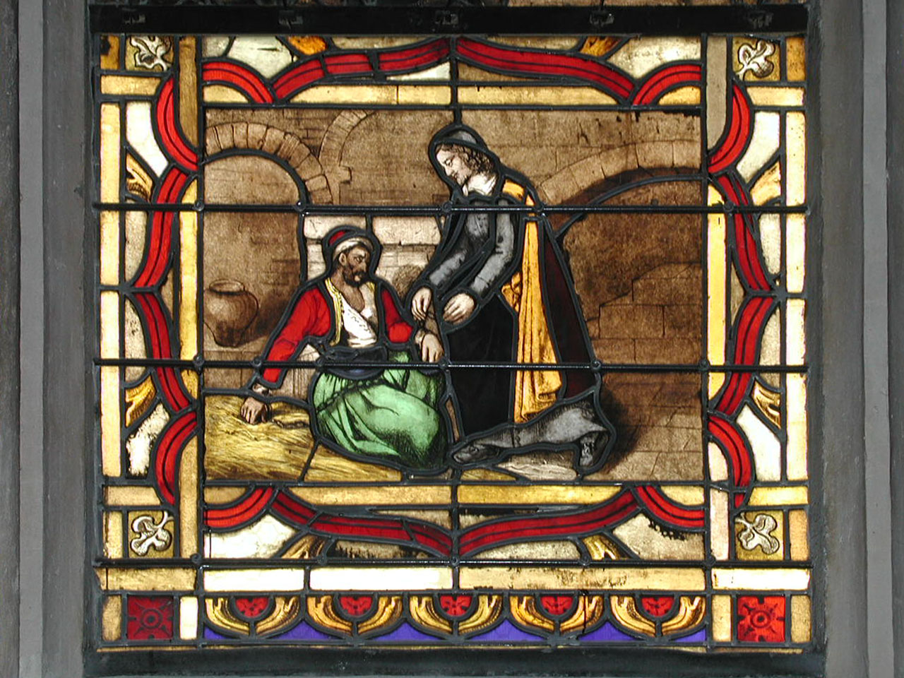 Vincent de Paul, young, helps prisoner in Turkish dress, in Paris prison. Original in St. Germain l'Auxerrois.