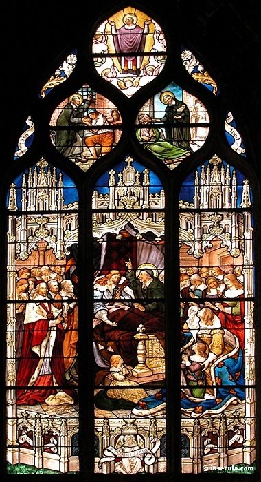 Vincent de Paul at deathbed of Louis XIII, surrounded by queen, children, courtiers, Card. Richelieu (already deceased); works of charity above; based on beatification series; original in parish, St. Severin