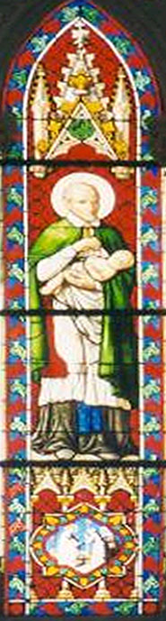 Vincent de Paul, in green cope, holding infant. Original in chapel of Sisters of Bon Secours, Paris.