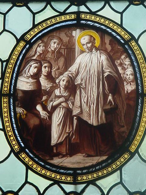 Vincent de Paul presents girl to care of Ladies of Charity, Louise de Marillac and Sisters in background; Latin: "SV caetus matronarum caritatis visitat et hortatur."