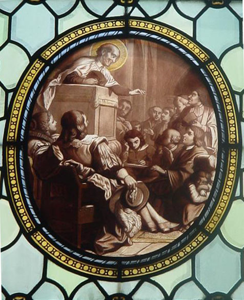 Vincent de Paul, in pulpit, preaching, Gondi couple in foreground, hence probably a Folleville; Latin: "SV verbum divinum per castella et pagos disseminat" Original in Macon, France