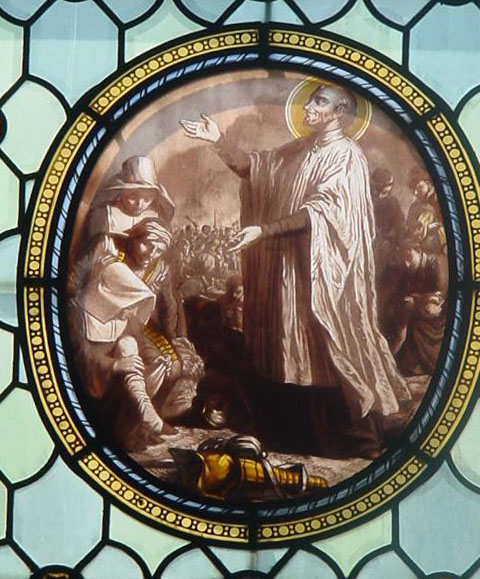 Vincent de Paul on battlefield, Sisters and priests care for wounded soldiers at the request of the king; Latin: "SV, sacerdotes suos pro sublevandis militibus ad regis nutum destinat."Window by Laurent and Gsel, Paris (no date)Window by Laurent and Gsel, Paris (no date)