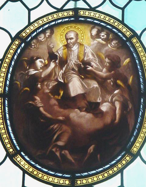 Vincent de Paul carried to heaven by angels; Latin: "SV, pro tot charitatis operibus in caelis gloriosus muneratur." Window by Laurent and Gsel, Paris (no date) Based on canonization painting in Rome