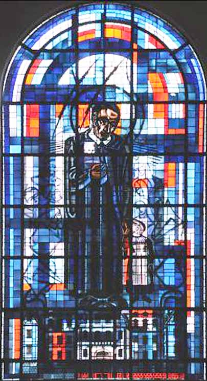 Vincent de Paul, standing, cassock, mantle, skullcap, halo; holding book; with priests, Sisters; mother house below (since the mother house is in this parish); internet image