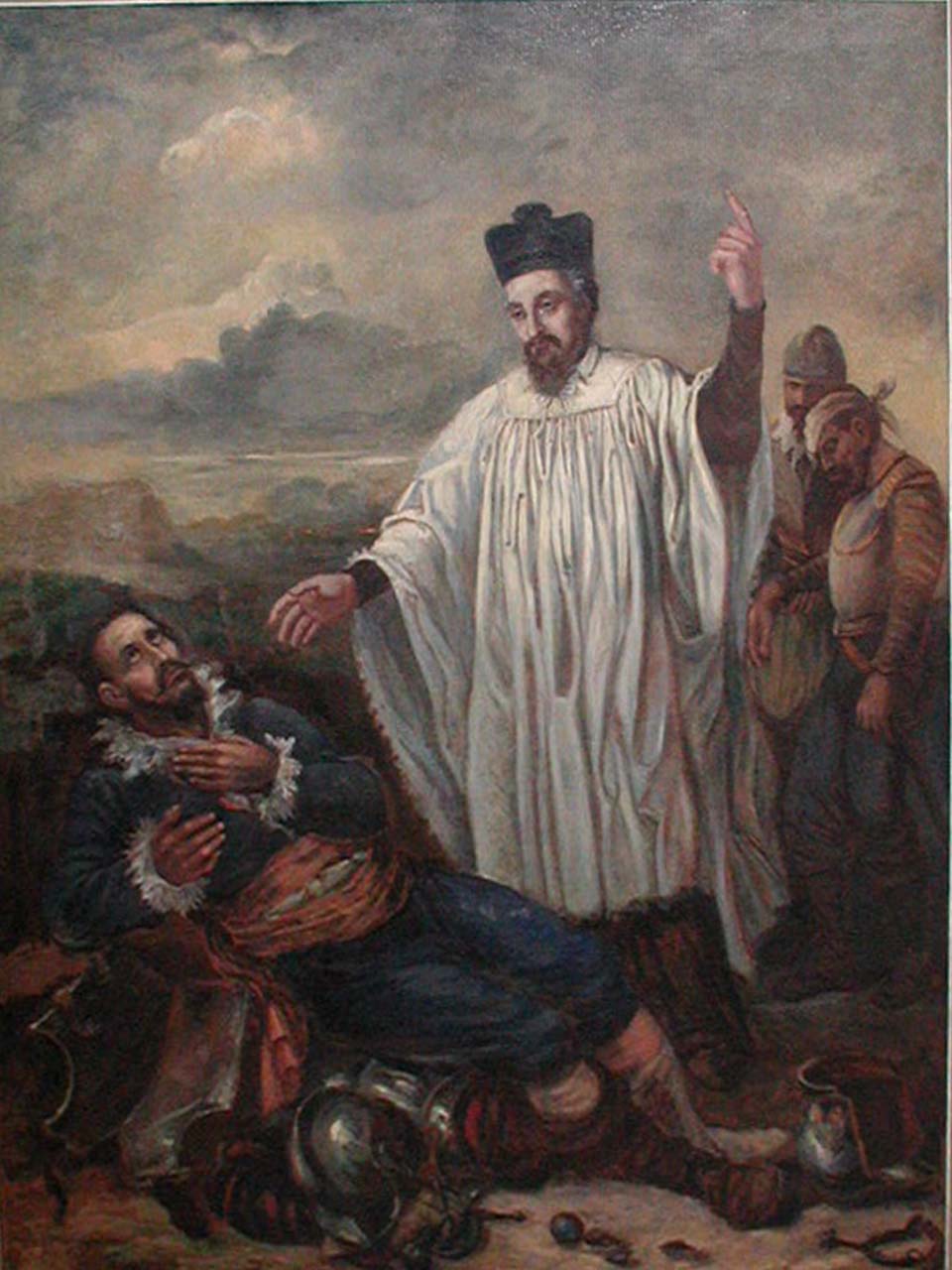 Mural painting; Vincent de Paul, cassock, surplice, biretta, speaking with wounded soldier on battlefield; two men in background; original in sacristy of the seminary church, Stradom, Krakow