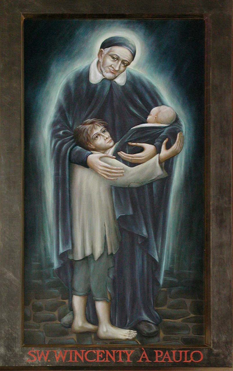 Framed painting; Vincent de Paul, standing, cassock, cape, skullcap, with two children; name below; original in Bl. Aniela Salawa parish, Krakow; painted by Adam Suzin for the same church.