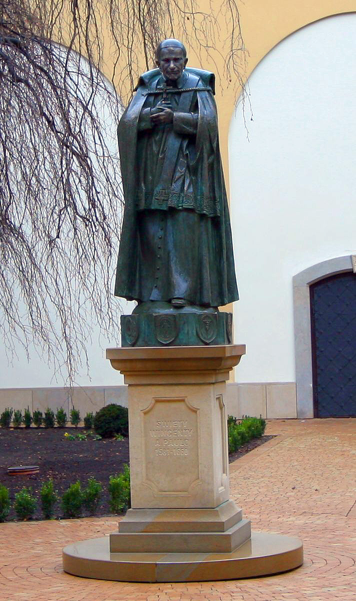 Bronze, Vincent de Paul, standing, cassock, surplice, stole, skullcap, cape, with crucifix; in Vincentian provincial house, Stradom; 2009; seals of CM, DC, etc., below; photo by Toma. Sculptor, Karol Bardyna, Academy of Fine Arts, Krakow.