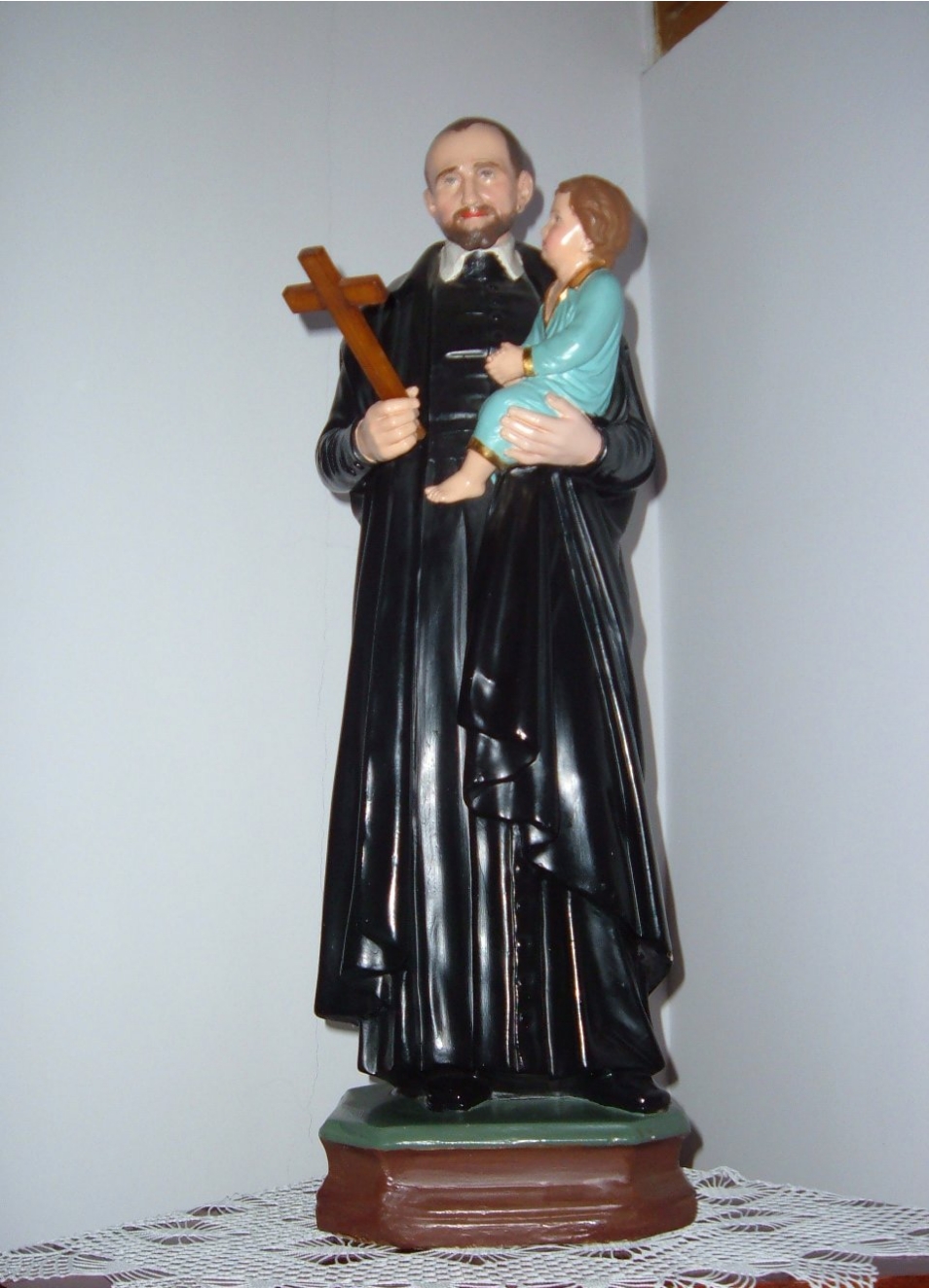 Painted plaster statue, VIncent de Paul, standing, cassock, cincture, mantle, holding girl with braids, blue dress, cross; in Daughters of Charity provincial house, Krakow