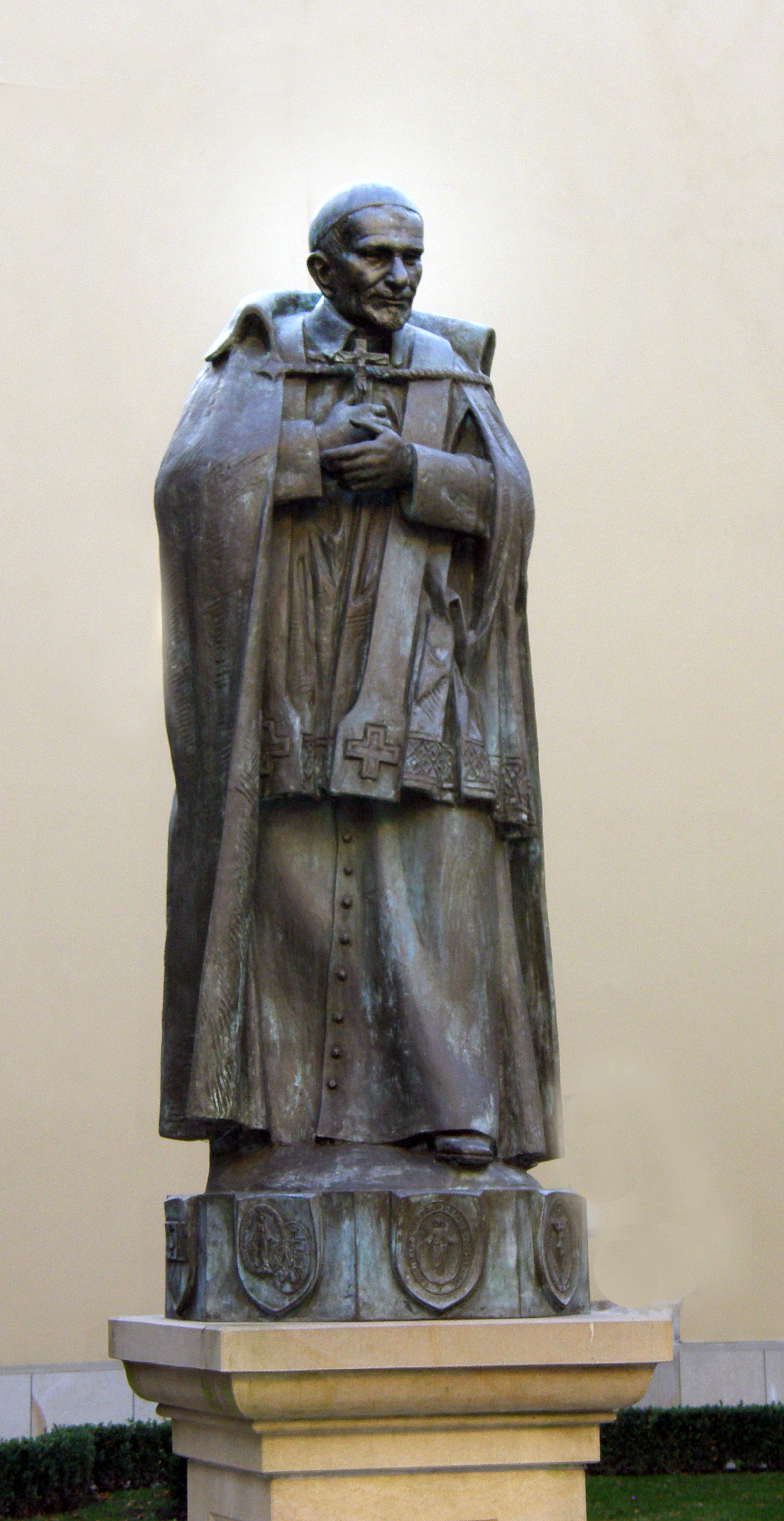 Bronze statue; Vincent de Paul, cassock, short surplice, stole, cape; holding crucifix; emblems of Vincentian family communities on base; at Vincentian house, Stradom, Krakow